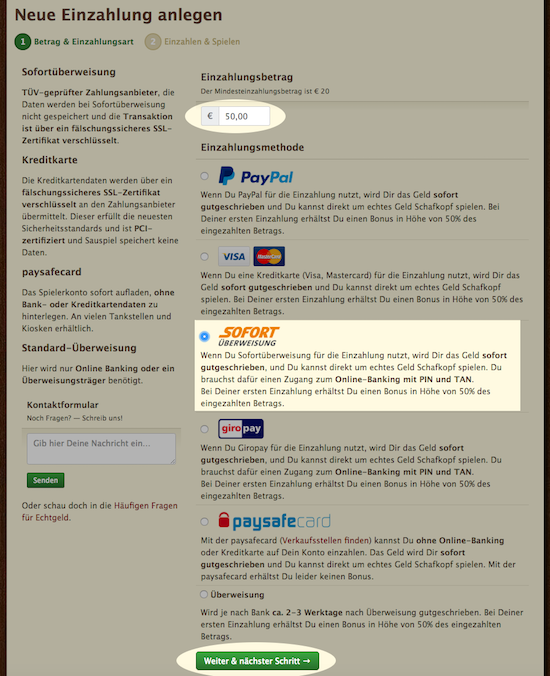 Im nächsten Schritt kann man auswählen, wie viel und über welche Einzahlmethode man einzahlen will. Indem man in das Feld mit dem Betrag klickt, kann man diesen verändern. Der Mindesteinzahlbetrag liegt bei 20€. Sobald ihr einen Betrag und eine Einzahlmethode gewählt habt, könnt ihr auf “Weiter & nächster Schritt” klicken.