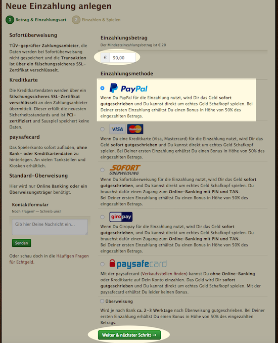 PayPal ist ein Online-Bezahlsystem bei dem Du ein Mitgliedskonto haben musst. Wenn Du PayPal benutzt, wird Dir das Geld sofort gutgeschrieben und Du kannst direkt um echtes Geld Schafkopf spielen. Hier kannst Du Dir einen Account bei PayPal registrieren.